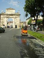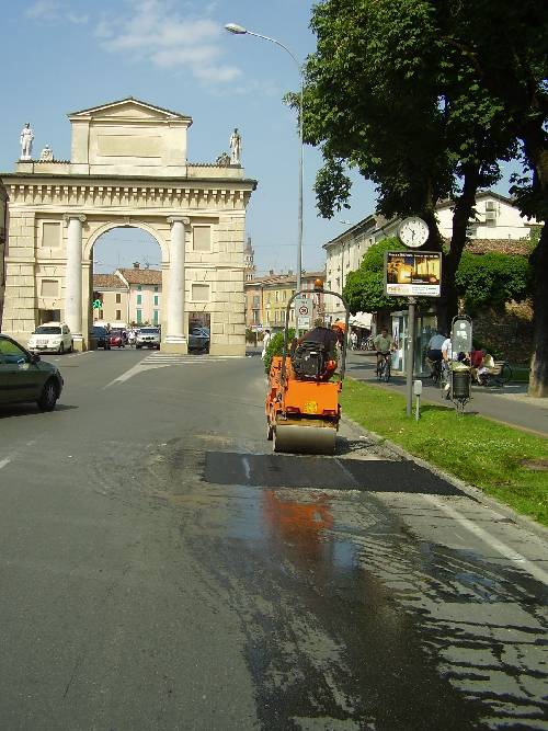 automezzo 3 assi ribaltabile con gru adibito al trasporto di macchine operatrici |  automezzo per trasporto macchina telescopica |  Rullo compressore in fase di costipamento tappeto d'usura per ripristino scavo acquedotto Via Cadorna nel Comune di Crema ( Cr ) |